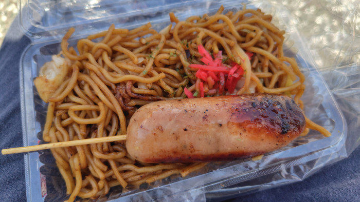 小腹が減ったので何か食べよう?って思って徘徊してたら何の出品かわからないけどフランクフルト+焼きそばセット600円で安いから買ってみました。
