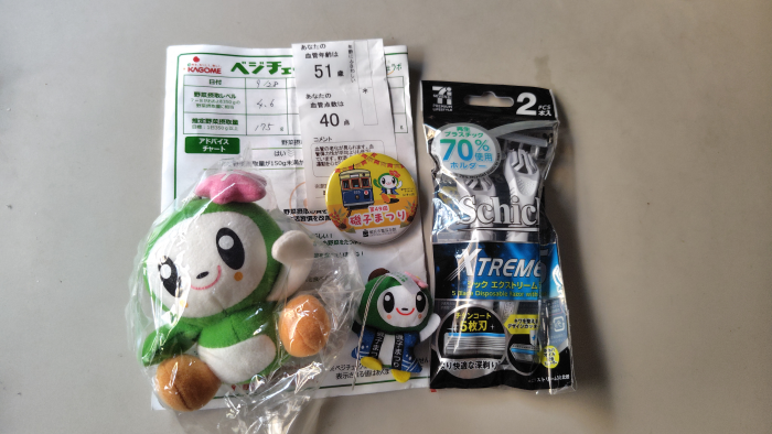 今回は人形二つに缶バッチ1個と謎のセブンブランドの髭剃りをゲットしました。ベジチェックで野菜175gって事で必要数半分でもっと野菜取れって事でした。血管年齢は51歳とご高齢で残念でしたね。血管年齢ってどうすれば若返るんだろう?