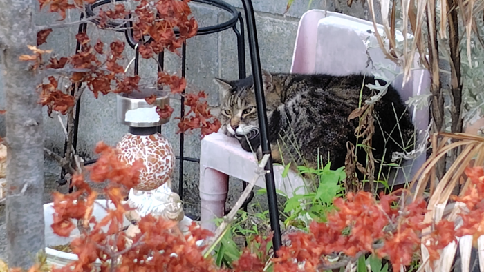 先日バーガーキングに行く途中にキジトラちゃんを見つけました。お家の前で椅子の上に丸くなっていましたね。何やら紅葉してる感じの中で猫ちゃんがいて可愛いね。写真を撮ってたけどこっちをちらっと見てまた寝に戻り可愛いですね。