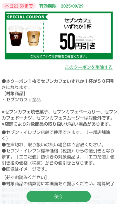 ふとセブンアプリを確認するとコーヒー50円引きクーポンを見つける事ができました。しかも期限が今日までとか丁度いいですね。10円引きクーポンはよくあるけど50円引きは珍しいですね。
