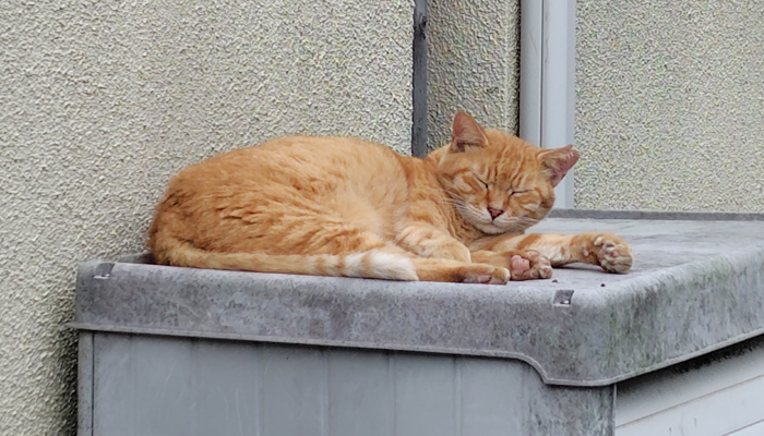 涼しくなったからかコンテナの上でスヤスヤお休みしてる茶トラちゃんを見つけました。肉球がピンクでかわいいね。ちょっと目を開けてこっちを見てたけど、自分に害が無いとわかるとまた目を閉じてスヤスヤ始めた寝始めてて可愛いですね。