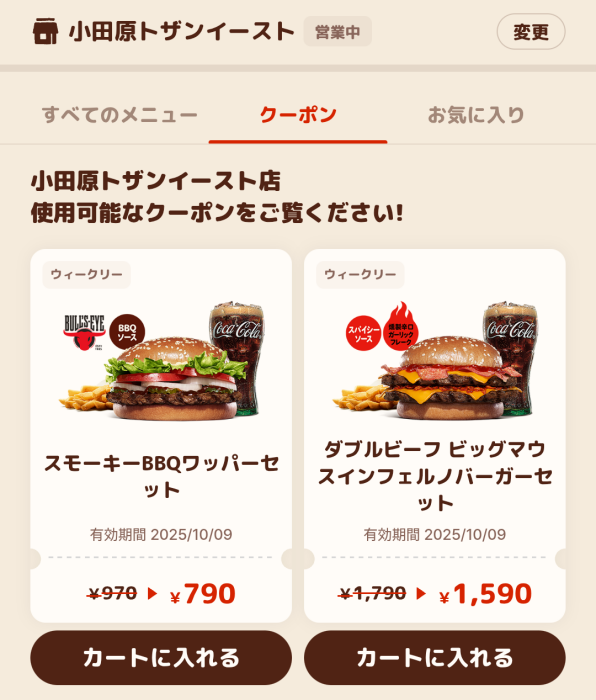 クーポンを確認したらスモーキーBBQワッパーセットが一番お安いセットだったので注文してみます。