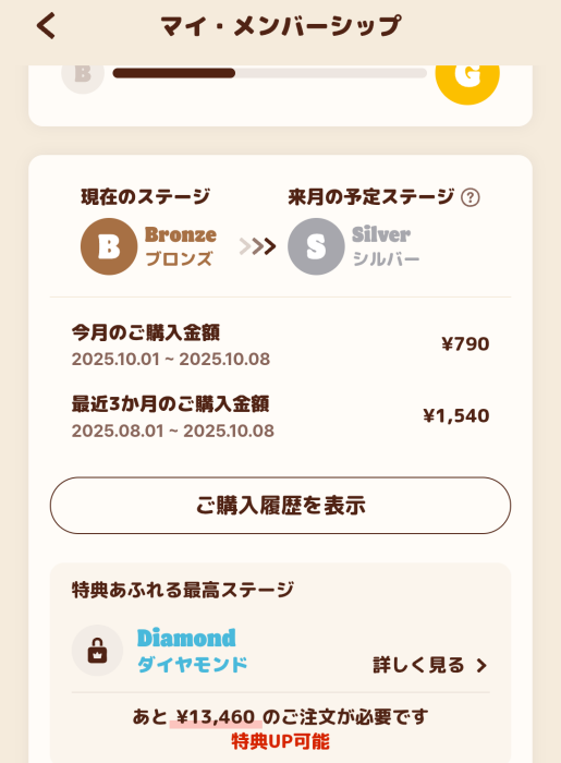食べた後にアプリのランクを確認してみたらブロンズからシルバーへと来月ランクアップが確定してますね。やったぜ!ダイアモンドランクまでは13,460円ほど食べる必要があるみたいですね。遠いね。