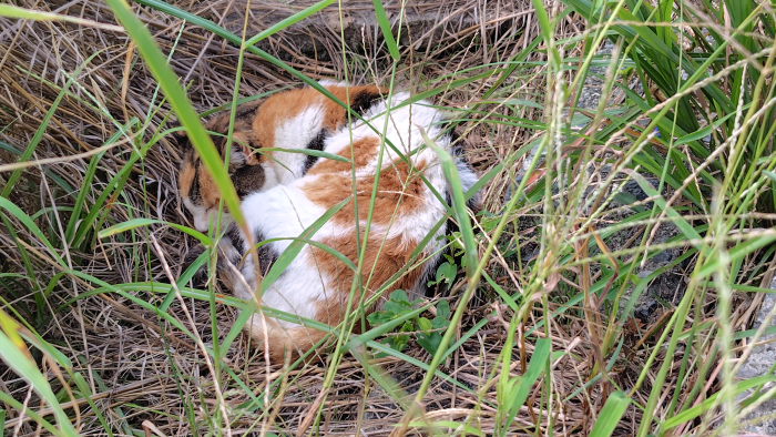 隣町へとお散歩中にいつもの三毛ちゃんスポットに寄ってみたら見つけました。草の中に丸まってぐっすりと寝ている感じですね。すやすやしててこちらに気が付いてるのか気が付いてないのか?とりあえず寝ているのを邪魔しちゃまずいので去りました。