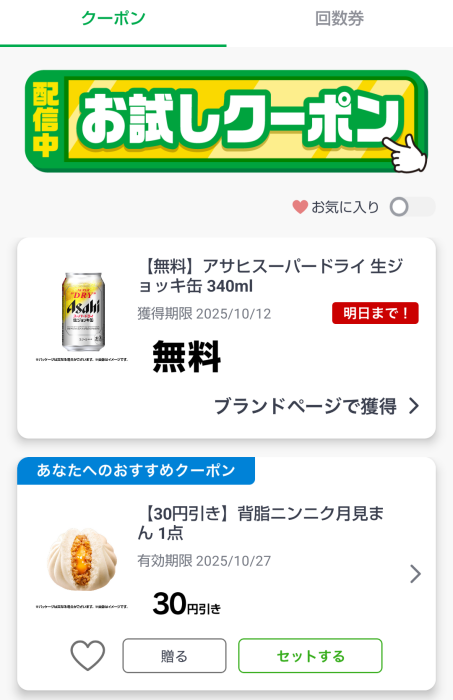 ファミペイから今サーバーダウンしてるアサヒのアサヒスーパードライ生ジョッキ缶の無料クーポンを貰えました。ついでに背脂ニンニク月見まんの30円引きクーポンあるから使って買ってみます。
