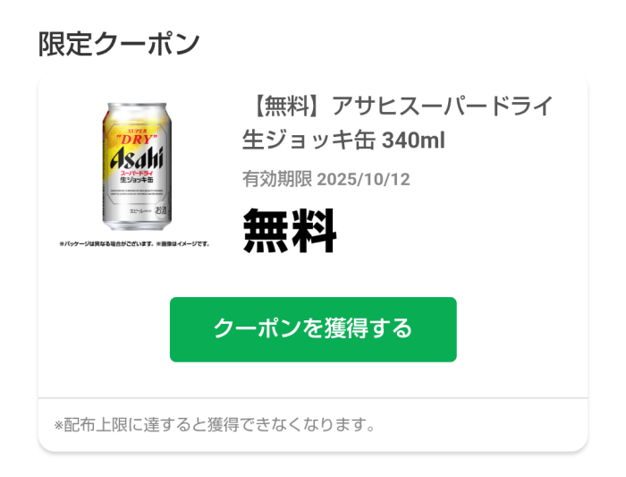 即クーポン貰ってると思ったらクーポンを獲得する必要があるみたいですね。配布上限に達する獲得できなくなります。とありますが有効期限12日ですが普通にクーポン獲得できますね。
