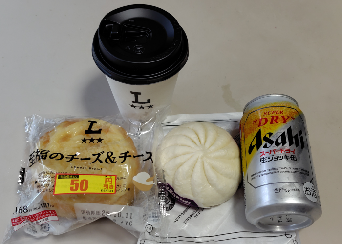 ファミリーマートとローソンから帰って来て戦利品を確認すると生ジョッキ缶と肉まんと至福のチーズ&チーズ50円引きとホットコーヒーですね。コーヒーは濃い目でいれてみました。