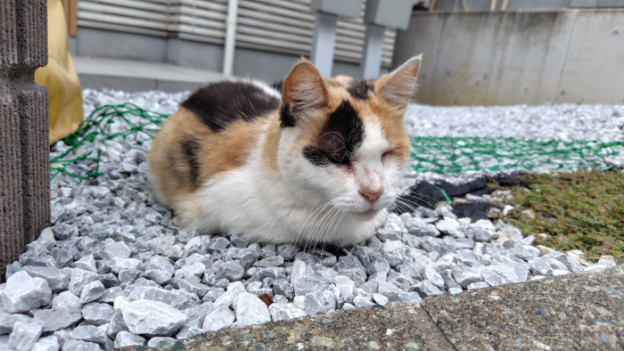 隣町から帰る途中にいつもの三毛ちゃんがちょこんと座ってましたので動き出す前に激写しました。かわいい三毛ちゃんなのだが足に身体をこすりつけられるとすげー足がかゆくなるので、撤収しちゃいました。