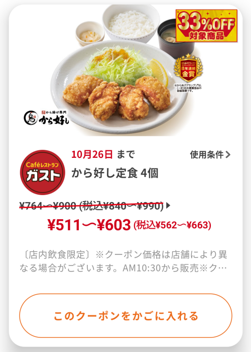 33%引きクーポンの中にご飯と味噌汁付きでセットになっているお得なクーポンがあったので食べてみようね。