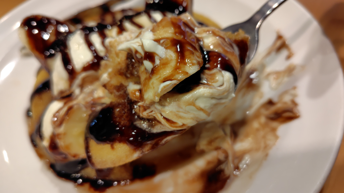 から好し食べ終わったので、チョコバナナとマスカルポーネのパンケーキを頼みました。このデザートですが注文する際にメープルシロップがデフォルトだと無しになってるのね。連打してたら無しで注文するところでした。