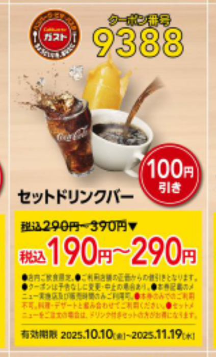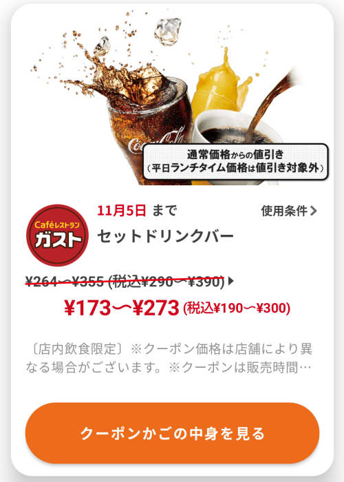 ドリンクバーも付けようかと思ってアプリクーポン見てみたら、300円でXクーポンだと290円で10円の違いがありますね。