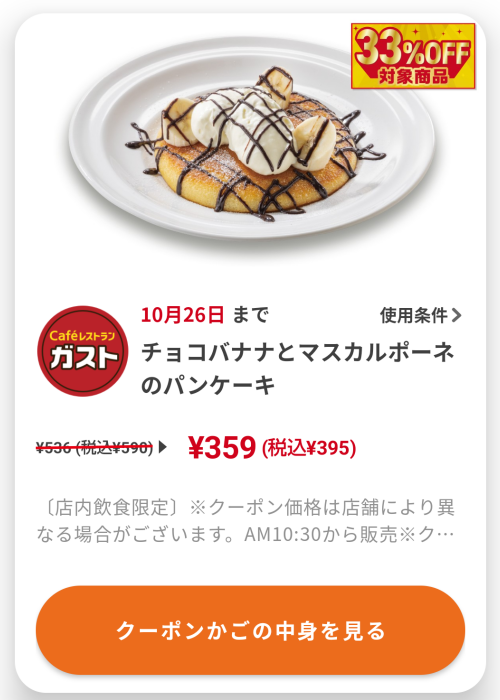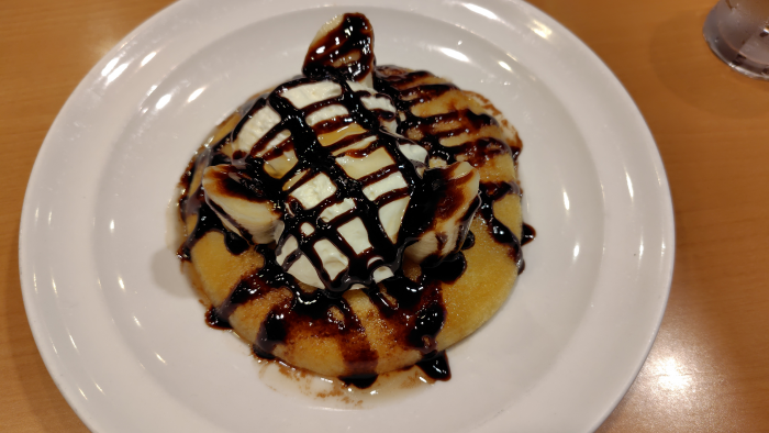 別に33%引きクーポンの中に395円のデザートがあって105円足すと食べられるから、このチョコバナナとマスカルポーネのパンケーキを頼んでいきます。
