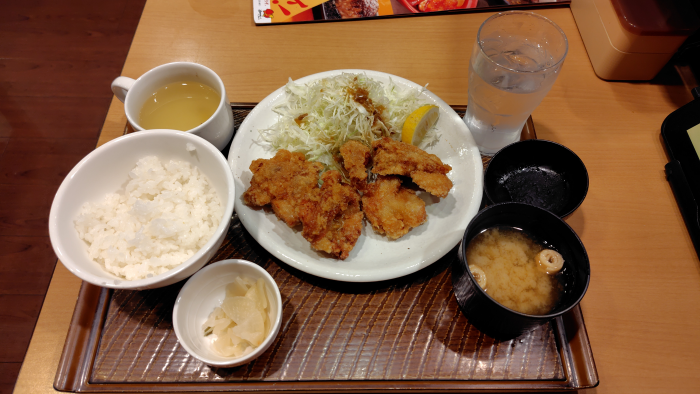 スープバーと水を飲みながら待ってたらから好し定食が届きました。から好しの唐揚げってもっと縦長で形が整ってると思ってたけど違うのね。スープバーと味噌汁で和と洋でいいね。