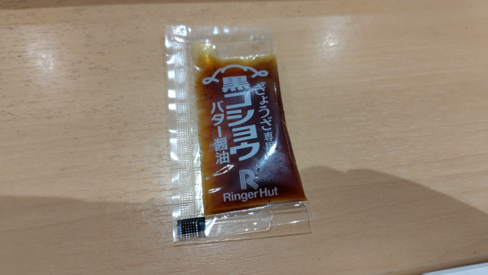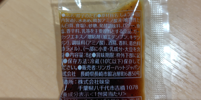 特殊な餃子タレが付いてきたけど黒コショウバター醤油ですね。水あめとかあんまり関係なさそうなのが成分で入ってますね。