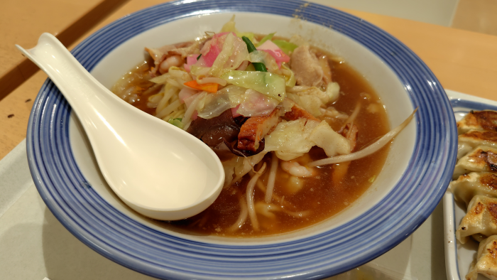 今回はセールちゃんぽん醬油味と餃子5個で1,120円なのを電子優待で支払ったので、ノー現金でフィニッシュすることができました。