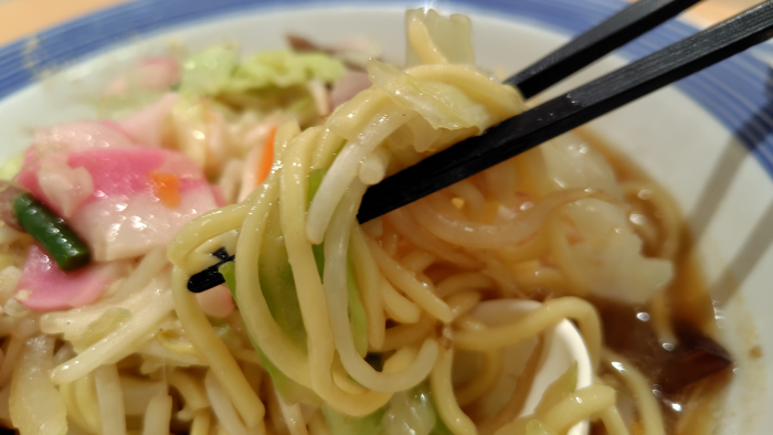 さて今回のメインである長崎ちゃんぽん醤油味ですね。見た目は普通のちゃんぽんのスープが茶色って感じなだけですね。