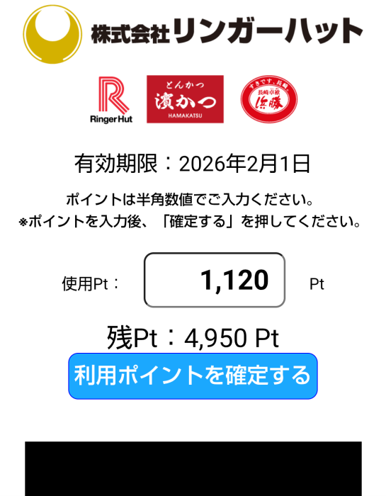 とりあえず今回のちゃんぽん醤油味+餃子5個セットを値段である1,120ポイントを確定してみたら、下の黒い所にバーコードが出ました。バーコード二個出てるから店員さんに両方ピッと読み込んでもらえば会計完了ですね。