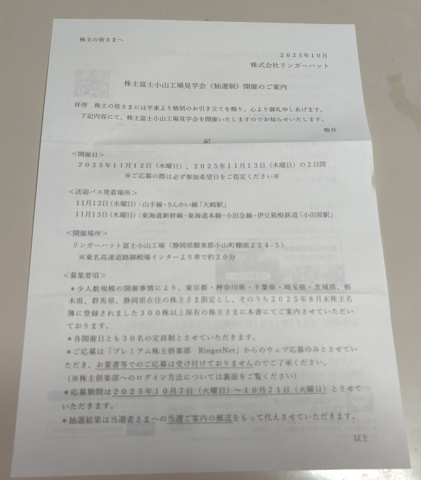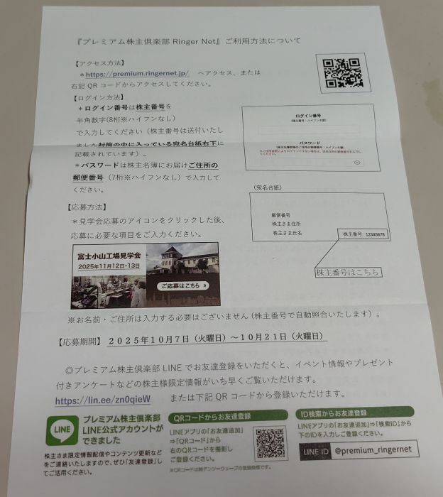 とりあえずリンガーネットプレミアム株主倶楽部へログインして、株主報告会と工場見学へ申し込みしてみました。当たるかな?