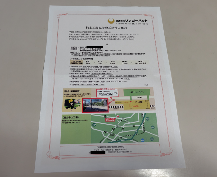 開封してみたら紙が1枚入っていました。以前申し込んでた株主工場見学の当選通知みたいですね。見学日になったら集合場所に行けば、貸し切りバスが来て工場まで連れてってくれるんだね。しれっと紛れ込める?って考えたけど、参加時はこの紙が必要だし事前に細かい説明とかの電話確認あるみたいだから不正参加できなさそうね。一人追加できたら父猫でも誘ったけど残念です。