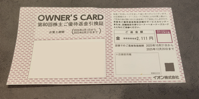 それで今回3月から8月までのイオンでオーナーズカードを提示してお買い物した金額に対してのキャッシュバックの金額が2,111円との通知が来ました。この株主ご優待返金引換証をイオン系のサービスカウンターに持ち込めば、書いてある金額を現金で受け取ることができます。