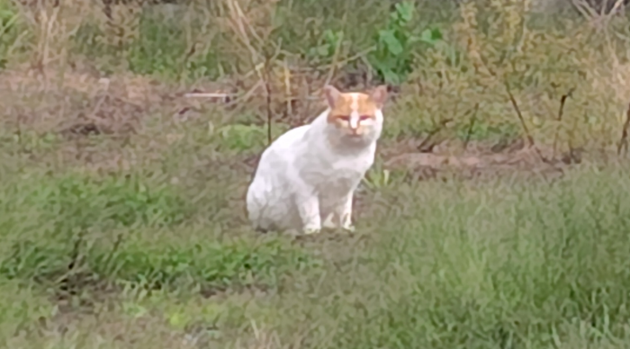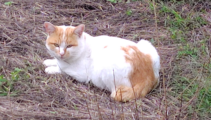 お昼ご飯を食べた後の帰り道で猫でもいないかな?とふと空き地を見たらふっくらした猫ちゃんを見つけました。身体が大体白くて太陽に反射してるのかふっくらしてる感じですね。警戒してこちらを見ていたので、裏に回ってみたら伏せてかなり警戒してこちらを見ていますね。まったりしてるのに何よぉ~!って顔してて可愛いですね。