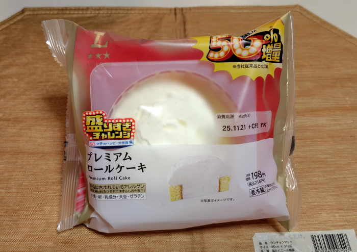 最後はデザートとしてプレミアムロールケーキを食べていきましょう。もう税抜きで198円なんですね。と思ったら前回200円越えで今回は値下げしてる?