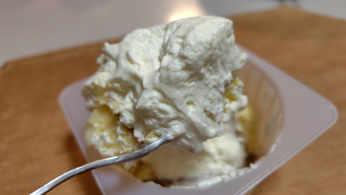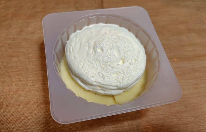 開封してみると生クリームがそそり立っていて生地が見えてますね。全盛期はこれでもかとクリームが充填されて下の生地が見えないかんじでしたが、最近は生地見えちゃってますね。けど食べてみると生クリームがちょっと飽きる感じの量なので、この量がギリギリ美味しく食べられるラインなのかもしれませんね。