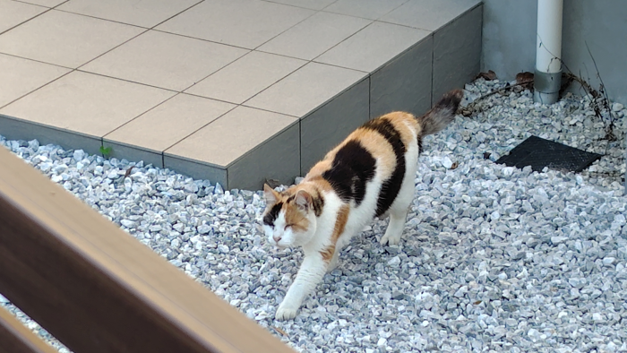 隣町に行く途中によく見かける三毛ちゃん。目が悪い感じですがこちらに気が付くと、ん~っと伸びをしてからこちらに来て脚にスリスリしてて可愛いですね。よくゴロンと転がって足をちょんちょん触ってワチャワチャして遊んでくれるので可愛いね。