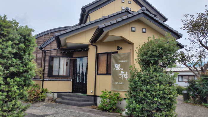安房鴨川駅からとぼとぼ石渡チキンセンターの方へ歩いて行って、奥まった場所にある民家かと思ってたのが風神ってお店だったみたいですね。開店時間だけど暖簾が縛ってあって準備中って看板あってやってないと思ったけど、父猫がガラッと入口開けて中の店員に確認したらやってるとのことで入店です。