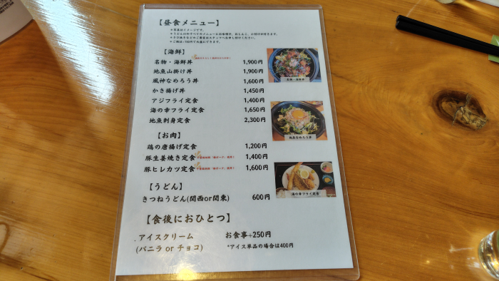 昼食メニューを確認すると名物・海鮮丼がおらが丼なのかな?1,900円となかなかのお値段ですね。他にも魚系が多くてついでにお肉系でうどんが1品ありますね。