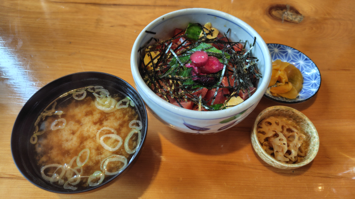 自分が頼んだのは名物海鮮丼でおらが丼とは言われてないけど、鴨川で出してる海鮮丼だからおらが丼だよね!具材は上はマグロと玉子焼きで敷き詰められててマグロ丼やん!と思ったら、下にタコやエビとかが埋まっていました。漬物と小鉢が付いていいですね。お味噌汁は出汁が丁度いい塩梅でよかったですね。この海鮮丼はちょっと酢飯の酢がきついのが難点かな?