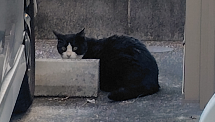 昨日のハチワレちゃんの兄弟なのか親子なのか同じハチワレちゃんですね。こっちは鼻の頭がピンクじゃなくて別個体ってわかりますね。すっごい警戒して即逃げるので写真撮るのは難しいけど、じーっとこちらを見て警戒してるので写真撮れました。