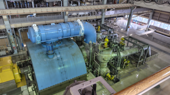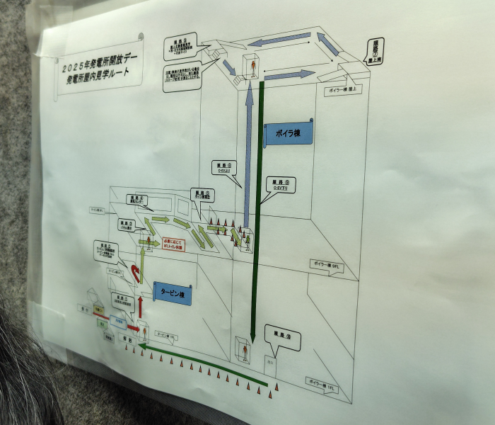 焼きそばを食べるか悩んでたら工場見学の時間が来たので見ていきましょう。今回はタービン見て、管理室をみてボイラー眺めつつ昇ってボイラー屋上をくるっと回って地上に降りる感じらしいですね。