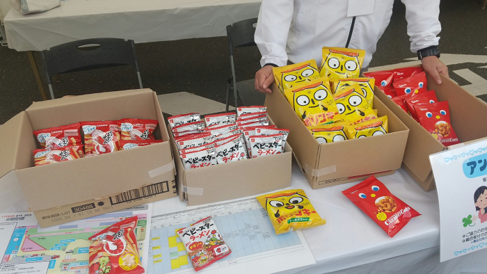 お祭りに関するアンケートを出すとお菓子をくれるって事なので、回答してキャラメルコーンとポリンキーを頂きました。有難いね。