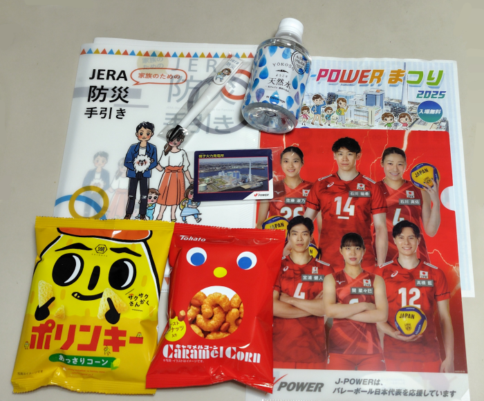 お土産にアンケート回答のお菓子2点と入場特典の水と火力発電所カードとクリアファイル2枚いただけました。楽しい思いして更にこんなにくれてありがたいですね。