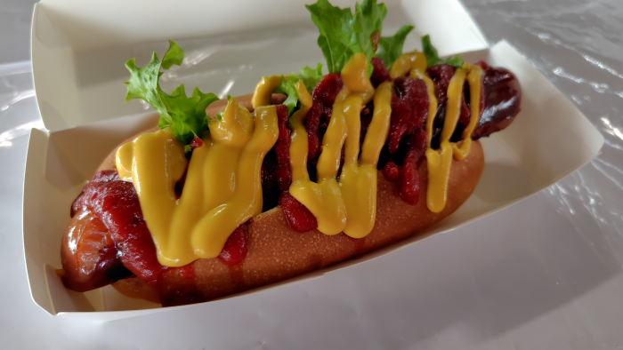 まず手始めにホットドックのノーマル400円を注文してみました。400円なのにデカいソーセージが挟んであるホットドックが出てきました。写真通りでありがたいですね。食べてみるとプリッとしたソーセージに油やケチャップなどを受け止めてくれるパンが丁度良くて、思わずお替りしようかと思っちゃいました。あとマスタードかけすぎたかな?