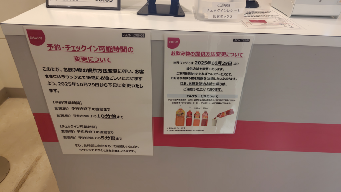 飲み物の提供方法変更についてが掲示されてましたね。セルフサービスタイプになってるんですね。チェックインの時点で何飲むか聞かなくなってきましたね。