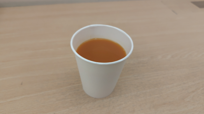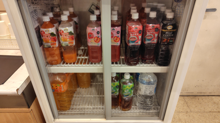 コーヒーサーバがある場所を確認したら冷蔵庫があって、前回の久里浜店と違って商品がパンパンに入っていますね。あと紙コップが置いてありますね。