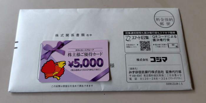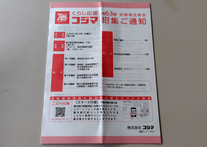 株式会社コジマからから株主総会招集通知が届いたのでお土産があるかを開封して確認していこうかと思います。