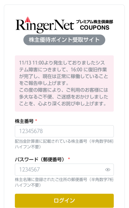 利用ガイドのQRを読み込んだら株主優待ポイント受取サイトにつながりました。株主番号とパスワードを入力してログインします。