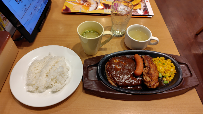 メインとして鉄板ハンバーグミックスグリルにライスドリンクバーセットを頼んでみました。スープバーとドリンクバーを飲みつつ待っていたら届きました。寒いから抹茶ラテやらスープが暖かくて美味しいね。バーミヤンと違ってお客が入ってきても寒い風が入らないのでありがたい。