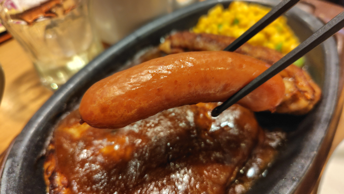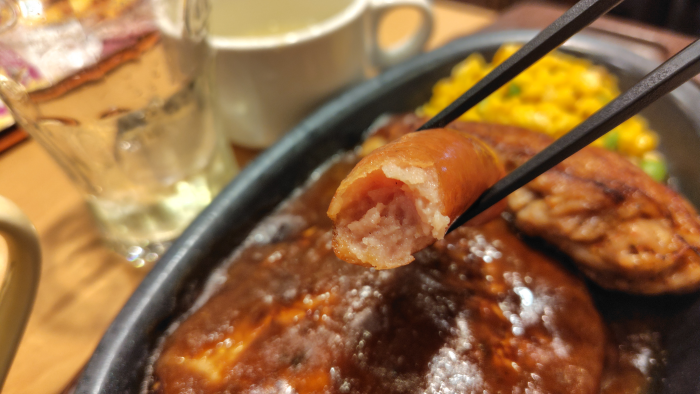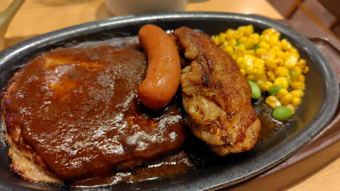 鉄板ハンバーグミックスグリルはハンバーグにソーセージに辛い鶏肉にコーンと枝豆の炒め物があるので、ちょっとした大人のお子様ランチ状態ですね。