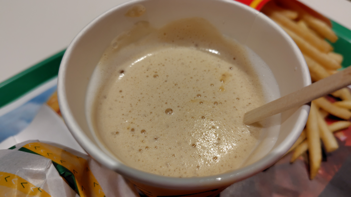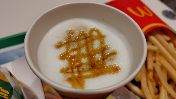飲み物は寒かったのでキャラメルラテを頼んでみました。苦くて甘くてなかなかいい味でした。マックバリスタのドリンクも頼めたら良かったのに優待では頼めないので残念です。