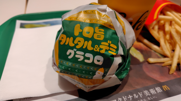 今回メインのグラコロであるトロ旨タルタル&デミグラコロですが、ちょっと小さい感じかな?包みを開けてみるとデミグラスソースがどばっとはみ出てる感じですね。