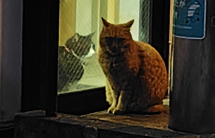 マクドナルド行く途中で見つけたツーキャット!お店の中にハチワレがいて外に茶トラがいますね。イカミミで警戒してて可愛いね。この茶トラは凄い勢いで撫でろ!って寄ってくるときと警戒したまま近寄らず、こっちが近寄ると逃げ出す時のある気分屋さんでかわいいね。
