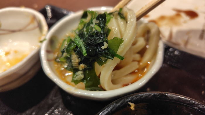 無料トッピングをぶち込んで食べてみたけど、ぶっかけはいつも食べ慣れた味わいで冬なので生姜が良い感じに効いて身体が温まりますね。かけ出汁にもトッピングを入れて食べてみたけどラー油や天かすが入ったことでパンチが効いてガツンとした味で食べられました。