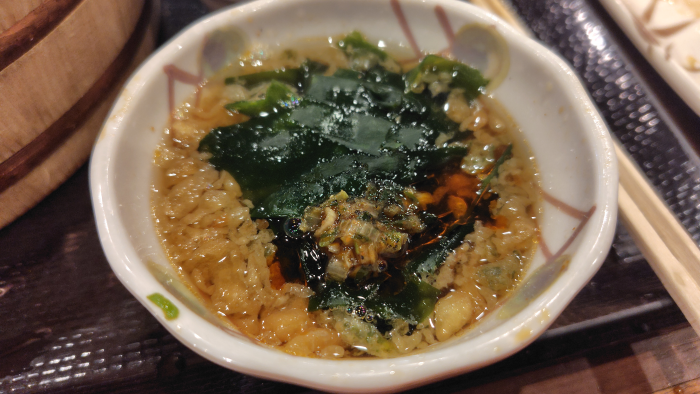 いつも通りトッピングをわかめやネギと天かすやら生姜に見えないけどラー油も全載せで持ってきました。小皿別々に入れて持ってくればよかったかな?