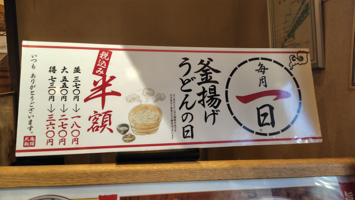 釜揚げうどんの日という事でいつものポップが展示されえました。半額になるのは有難いですね。