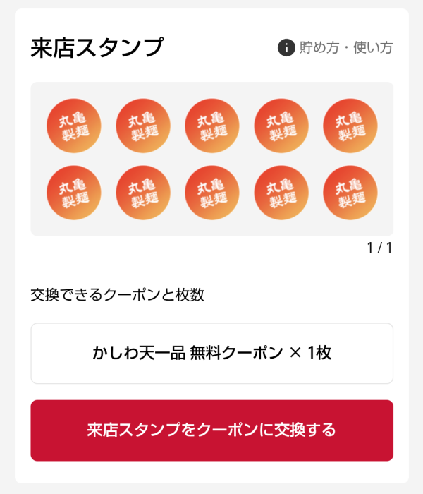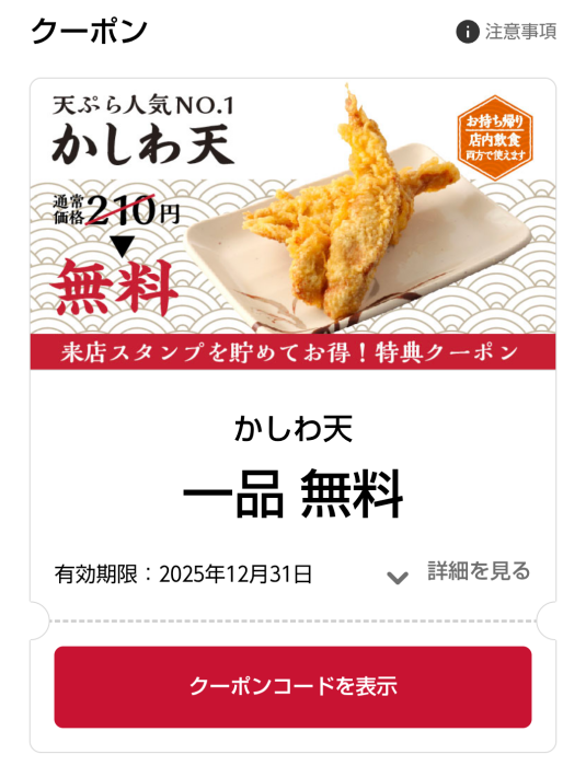 それと前回の来店で来店スタンプがとうとう全部貯まったのでかしわ天の無料クーポンをゲットできました。来店スタンプをクーポンに交換するをタップして、更に交換確定させるとクーポン一覧にかしわ天1品無料のクーポンが登場しました。