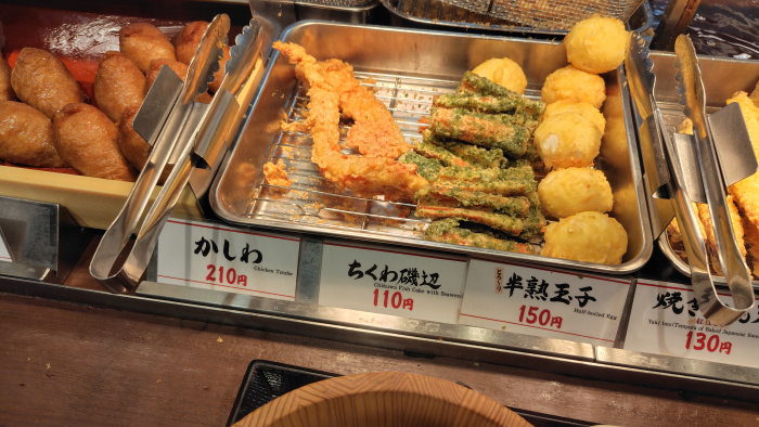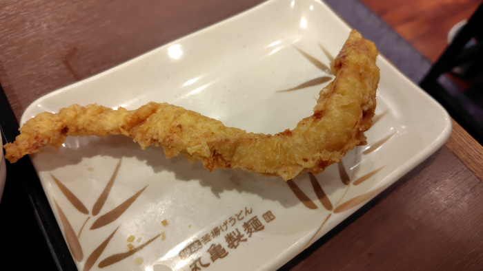 かしわ天はひょろ長いやつを選んだのでちょっと皿からはみ出ていますね。ソースをかけて齧ってみたけど鶏肉にすーっと味が染みわたって美味しいですね。ぶっかけ汁につけると味が濃い目で鶏肉の味を引き立ててくれるし、かけ出汁につけて食べると全体的にまろやかに食べる事ができました。